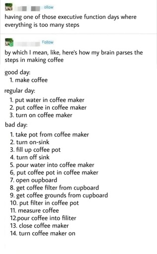 I’ve heard this is a good analogue to dementia. When you list out all 14 steps of making coffee, it’s not surprising that someone with an impairment gets things wrong.